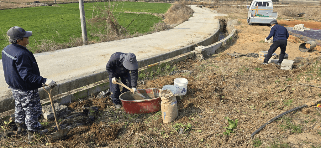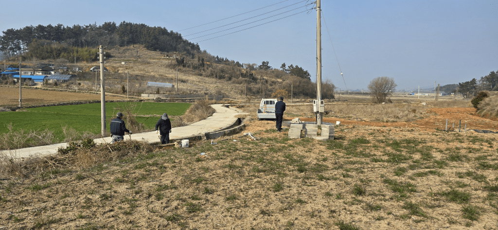 이것은 며칠 전, 3월 12일에 열심히 500평 밭 앞쪽에 둘 컨테이너의 지지 구조를 만들던 순간에 찍은 사진들이다. 무성하게 자란 잡초들을 베어내고, 박혀있는 나무와 진흙, 그리고 폐 잔해들을 열심히 치우고 시멘트와 몰탈을 가지고 4시간 정도 일한 것 같다.